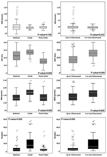 The differences presented in Table 1 are shown as boxplots (Figure 3) for MDA, GSH, GST, and Hg-B. Oxidative stress biomarkers and Hg levels differences related to the frequency of fish consumption are also displayed.