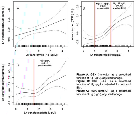 Smoothed function of oxidative stress biomarkers and their relationship with Hg. (A) GSH as a smoothed function of total mercury concentrations in blood (Hg-B), coefficient of ln (Hg): 0.024 (p-value = 0.052). (B) GST as a smoothed function of Hg-B. (C) MDA as a smoothed function of Hg-B. The relationship between GSH and Hg was linear. The relationship between Hg and GST was established using a spline with 2 knots inserted in the ln-transformed values of Hg (1 and 2.5 ≅ 2.72 and 12 µg/L of Hg). The relationship between Hg and MDA was established using a spline with df = 2.