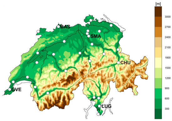 Location and elevation of the 28 considered automated stations of the Swiss national weather service MeteoSwiss (SwissMetNet stations). The selected sites are consistent with the heat warning-relevant elevation of <600 m [48]. The stations Basel (BAS), Chur (CHU), Geneva (GVE), Lugano (LUG) and Zurich Fluntern (SMA) serve as exemplary sites for later analyses.
