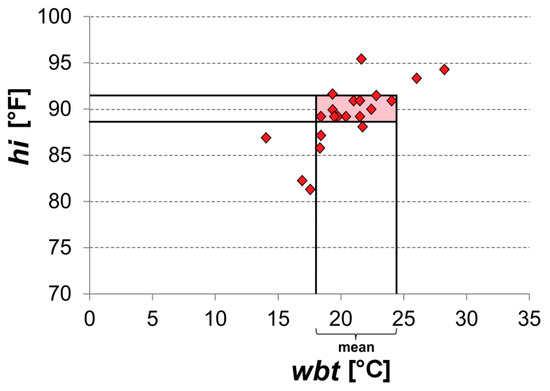 Exemplary Swiss-wide threshold calculation for wet bulb temperature (wbt) on the basis of 88 °F < hi < 92 °F. The markers represent virtual wbt and heat index (hi) pairs for all stations together.
