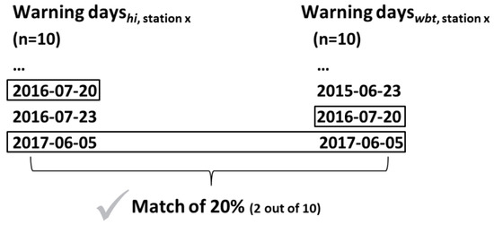 Exemplary matching of warning days (n = 10) based on hi (left) and wbt (right) for a station x. The black boxes mark matching warnings. Two out of ten wbt-based warning days match the official hi-based warning days, resulting in an overall 20% match using wbt in station x.