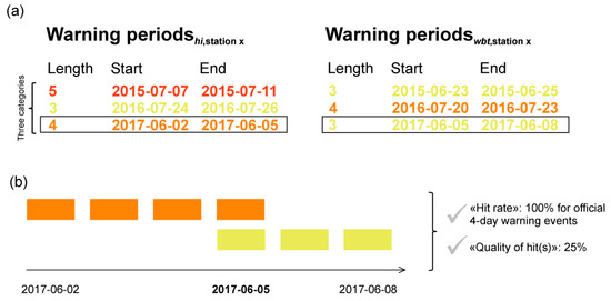Exemplary warning periods for a station x, based on hi (left) and wbt (right). The warning periods are separated into three-, four- and five- (or more) day events according to their lengths. The black boxes mark warning periods that offer at least one day of overlapping warnings (a). In this example, the official four-day warning event is captured by one overlap (5th June 2017) when using wbt, which results in a “hit rate” of 100% in the 4-day event category and a “quality of hit(s)” of 25% (b).