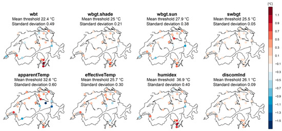 Spatial anomalies of site-specific thresholds (color-coded) and spatial averages and standard deviations of the site-specific thresholds (on top of each map) for the considered indices wet bulb temperature (wbt), wet bulb globe temperature in the shade (wbgt.shade), wet bulb globe temperature in the sun (wgbt.sun), simplified wet bulb globe temperature (swbgt), apparent temperature (apparentTemp); effective temperature (effectiveTemp), humidity index (humidex) and discomfort index (discomInd). Anomalies are computed wrt. the respective spatially averaged site-specific threshold. Blue colors apply to negative threshold anomalies, red colors to positive threshold anomalies.