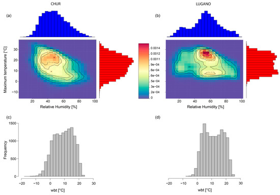 The 2-dimensional Kernel density plots of temperature and relative humidity (a,b) and the resulting distribution of wbt (c,d) for Chur and Lugano for the period 1981–2017. In Figure 6a,b, the top and right axes show the histograms of temperature (red) and relative humidity (blue). The density plots combine the distributions of both variables with red colors referring to higher probabilities and blue colors to unlikely conditions.