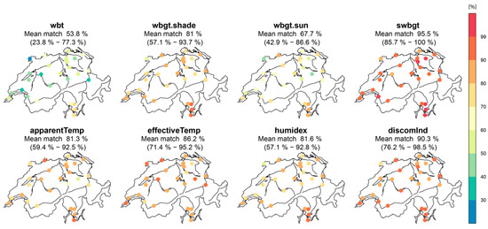Figure 12 illustrates the matches of overlapping warning periods in accordance with index-specific, but Swiss-wide thresholds for wbt (Table 2, third column). Bear in mind that, under this approach, the frequency of warning days is not necessarily the same for the hi and the alternative indices. Depending on the station, these matches (“hit rate” and “quality of hit(s)”) are higher (lower) compared to using site-specific thresholds, as a larger (smaller) number of days exceeds the warning level, which increases (reduces) the probability of overlaps with official warning periods. By focusing on selected stations (Figure 1) the pronounced station dependency of using Swiss-wide instead of site-specific thresholds becomes clear.