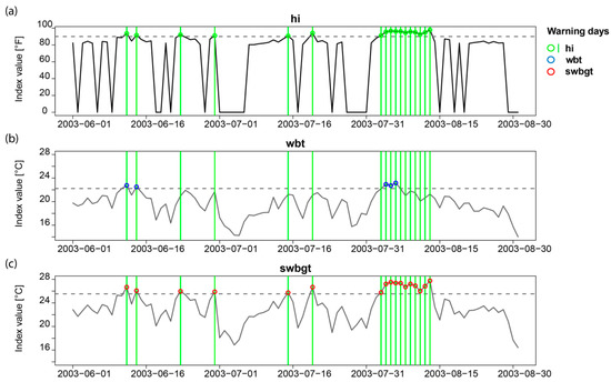 The daily evolution of hi (a), wbt (b) and swbgt (c) in Basel in summer 2003 and the respective warnings days: Green vertical lines (a–c) and green dots (a) show the official warning days based on hi, blue dots indicate warning days based on wbt (b) and red dots show warning days based on swbgt (c). Dashed horizontal lines mark the site-specific thresholds of each index.