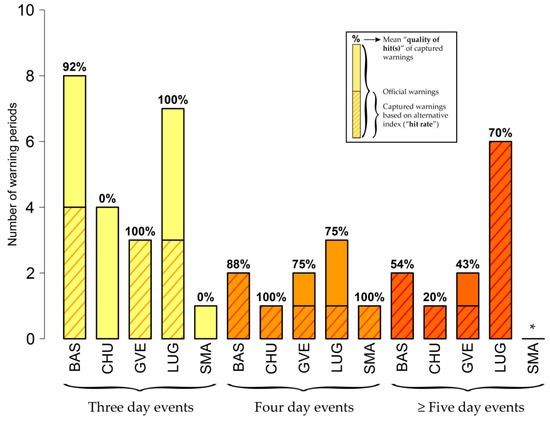Matches of overlapping warning periods based on wbt (Swiss-wide threshold) compared to hi. The warning periods result from the use of Swiss-wide thresholds (i.e., the number of warning days is different for the hi and the alternative index, see Section 3.2.2). Compared to the number of warning days calculated with the site-specific threshold (WDsite), the number of warning days changes individually for each station when using a Swiss-wide threshold (WDCH): BAS (WDsite #119 vs. WDCH #154), CHU (WDsite #70 vs. WDCH #33), GVE (WDsite #96 vs. WDCH #53), LUG (WDsite #111 vs. WDCH #509) and SMA (WDsite #31 vs. WDCH #38). The figure presents matches for three- (yellow), four- (orange) and five- (or more, dark orange) day official warning events. The shaded bars give the number of official warning periods for the respective duration. The dashed bars show the number of warning periods captured by wbt (indicating the “hit rate” when compared to the length of the entire bar). The percentage on each bar gives the mean “quality of hit(s)”. In Basel (BAS) and for the case of three-day warnings, for instance, six warning periods based on wbt show an overlap with (in total) eight official three-day warning events (“hit rate” of 75%). In the mean, these overlapping warnings show a 94% match (“quality of hits”). The asterisk applies to stations without any official warning periods in the respective category.