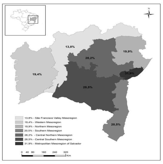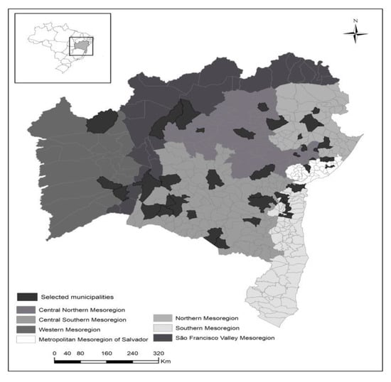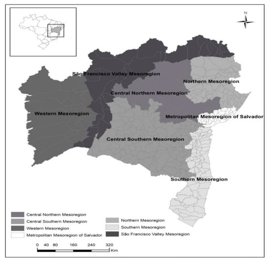 The state of Bahia consists of 417 municipalities, organized in seven mesoregions, namely: Western Mesoregion (24); São Francisco Valley Mesoregion (27); Central Northern Mesoregion (80); Northern Mesoregion (60); Metropolitan Mesoregion of Salvador (38); Central Southern Mesoregion (118) and South Mesoregion (70) (Figure 1) [].