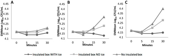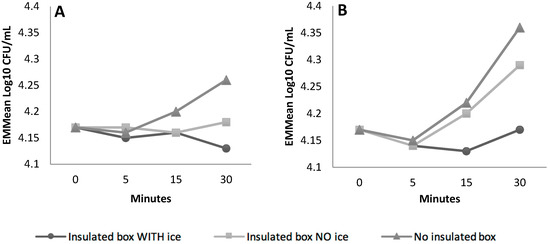 The EMMeans plots show an increase in pathogen concentration across all incubation temperatures and storage types, except for an insulated box containing an ice brick (Figure 1) where the concentration of E. coli O157:H7 StrR decreased and L. monocytogenes StrR was restored to initial baseline concentration after 30 min (Figure 2).