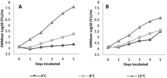 Previous studies have demonstrated that domestic refrigerators often operate above recommended temperature, that consumers are unaware of the temperature status of their refrigerators and that milk is not commonly stored in the coldest area of the refrigerator [26,42,43,44]. In this study, the concentration of both pathogens increased more rapidly under mild (8 °C) and moderate (15 °C) temperature abuse conditions compared to the recommended refrigeration temperature of 4 °C. Although, by day 5, the difference in the EMMeans of the L. monocytogenes StrR stored at 4 °C and 8 °C was only 0.12 log CFU/mL. The growth of L. monocytogenes in refrigerated foods is well established due to its psychrotrophic nature and our findings support previous research demonstrating the growth of L. monocytogenes in refrigerated RCM [16,44,45]. The findings demonstrate that the refrigerated storage of RCM can contribute to pathogen growth over time, even at recommended refrigeration temperatures.