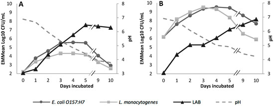 EMMeans of E. coli O157:H7, L. monocytogenes, lactic acid bacteria (LAB) and pH at a lower 102 (A) and higher 106 (B) pathogen inoculum level over 10 days at 22 °C.