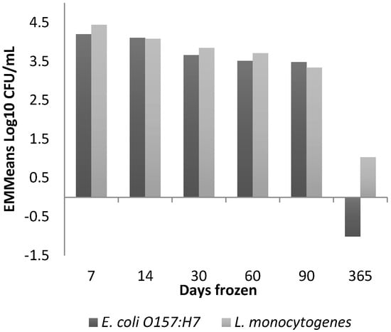 The pathogen species and the duration of frozen storage had a significant effect on the viability of both pathogens in RCM (Table S4). The interaction between the pathogen species and the duration of frozen storage had a large (η2 = 0.27) and significant (p = 0.032) effect. While L. monocytogenes StrR was recovered following the freeze/thaw process after 365 days, the EMMeans of E. coli O157:H7 StrR indicate that this pathogen did not survive over this time (Figure 5). The pre-freeze duration (immediately frozen vs. 4 day delay), thawing methods (overnight at 4 °C or incubated at 22 °C until thawed) and pathogen inoculum level did not have a significant effect (p > 0.05) on the pathogens. After removing the 365 day parameter from the GLM analysis, we found no significant outcomes across all factors.