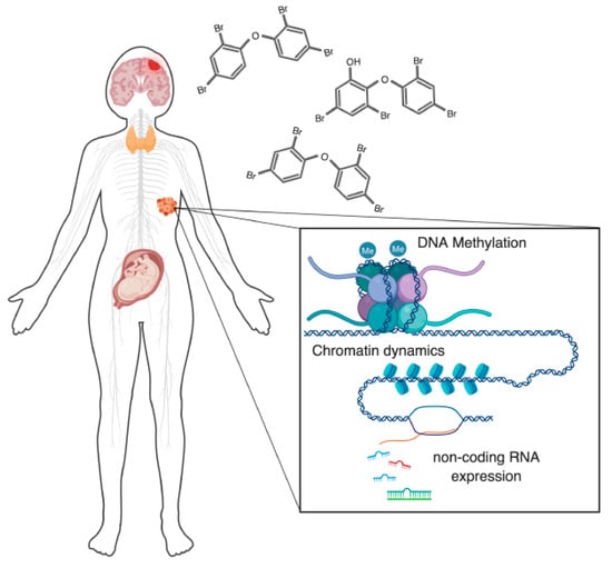 PBDEs are a group of environmentally persistent chemicals that have been widely used as flame retardants on household consumer products since 1970s. Due to their environmental stability and propensity for bioaccumulation, PBDE concentrations have ubiquitously and cumulatively built up in our environment and in our bodies around the globe. Intriguingly, PBDEs enter the environment from both anthropogenic and natural sources. Historically, these compounds were first described in the biomedical literature as early as the 1960s—a decade before their anthropogenic production—when they were isolated from Australian marine sponges (Dysidea sp.) and found to have antimicrobial properties [6,7,8]. They have also been isolated from various red algae [9,10]. Recently, in the case of sponges, it was demonstrated that PBDEs are actually produced by symbiotic cyanobacteria and are theorized to confer some level of microbial resistance to the host sponges, although the mechanism(s) by which the compounds are toxic to other organisms remains unknown [11]. It is interesting to note, however, that these compounds are excreted by the cyanobacteria and subsequently accumulate in high concentrations, crystalizing in the sponge ectosomal tissues. This is perhaps how sponges avoid the compounds’ toxic effects and how they may be a defense mechanism against potential eukaryotic predators such as fish in addition to other prokaryotes [12]. In the context of human health, it is unfortunate that such a class of compounds, whose natural production was likely evolutionarily driven by their toxicity, ended up becoming a flame retardant of choice for consumer products. Understanding the natural origins of PBDEs may also inform our investigation of their biological effects in humans, which is of pressing importance given another unfortunate aspect of PBDE biology—the growing evidence for their epidemiological association with neurodevelopmental disorders (NDDs). In this review, we will briefly discuss known biological mechanisms affected by PBDEs, focusing on epigenetic impairments and the impacts these disruptions may have on human health, especially in the context of neurodevelopmental disorders.