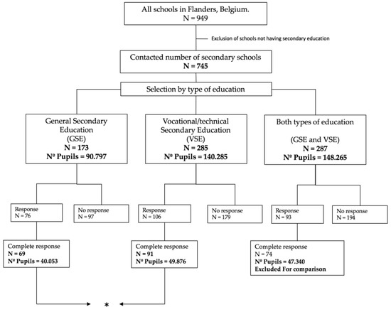 Flow chart of sample recruitment. Only schools that returned a complete response to the questionnaire were used for analysis. (*) indicates which schools were compared, (N) total number of schools and (Nº) number of pupils studying at each type of education.