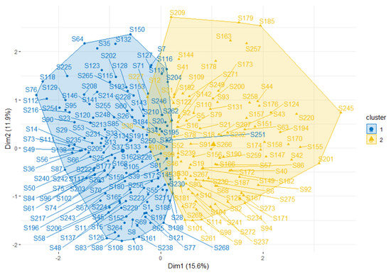 Moreover, SES differed significantly among school types, which is similar to what is present in the general population of schools in BE-F [23]. VSE schools had a significantly higher percentage of adolescents whose mothers had a lower level of education as compared to those of GSE schools (p < 0.05). The relationship between this SES indicator and school type was further analysed, and in Figure 2 the existence of two main groups answering the questionnaire with a similar pattern and having a significant association with the SES indicator is visualised. Interestingly, one of the clusters was mainly represented by GSE schools with a lower number of students with low-educated mothers, and the other cluster was represented by VSE schools with a higher percentage of students whose mothers have no higher education. Since mothers with lower education demonstrated being more permissive to certain food items according to a previous study performed in Belgium [24], this SES combined with the regulations present in schools could contribute to the final social background that might additionally influence the adolescents’ dietary choices.