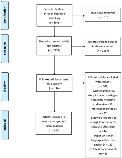 Preferred Reporting Items for Systematic Reviews and Meta-Analyses (PRISMA) flow diagram illustrating the search and selection process of a March 2019 systematic review of the literature on prevalence of anxiety among medical students. a One article (El-Gilany, 2008) reported two studies.