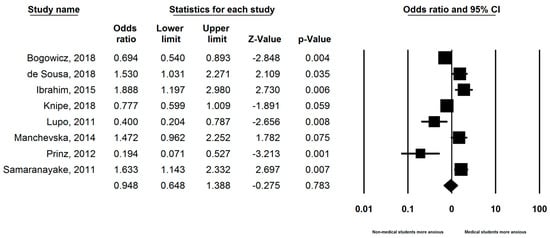 Eight studies compared the prevalence of anxiety between medical students and non-medical students. Table S5 illustrates the comparison of prevalence rate of anxiety between medical students and non-medical students as reported by the eight studies. Odds ratios calculated from these studies are represented in Figure 3. The pooled OR between the two groups was statistically insignificant (OR 0.948, 95% CI: 0.648–1.39; p = 0.78).