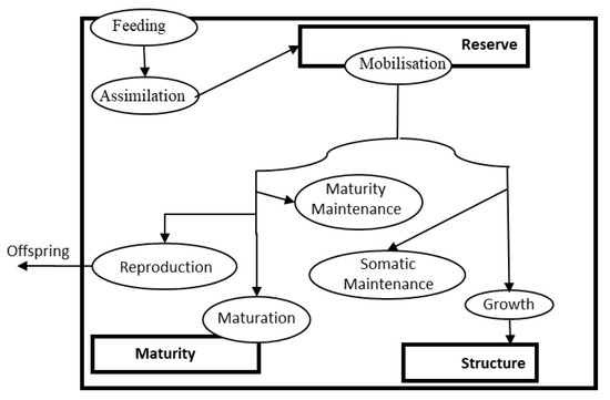 Besides ecosystem-based modelling tools, a theoretical and modeling framework that has been gaining momentum for ecotoxicology and multiple-stressor studies is Dynamic Energy Budgets (DEB) [107,108,109,110]. DEB theory is a non-species specific theory at the organism level that describes and quantifies metabolic processes, such as the growth, development, and reproduction of organisms. The metabolic organization of the standard DEB model, which is applicable to animals that maintain their shape as they grow, is shown in Figure 1. The biomass of the organism is composed by structure and reserve while the life-stage that controls the metabolic processes that the organism has access to is controlled by the level of maturity. Organisms increase their maturity until achieving first the level of maturity that triggers the feeding behavior and then the level of maturity that triggers the reproduction behavior. The mass and energy allocated by the organism to metabolic processes such as growth and maintenance depends on the state of the organism (maturity, reserve, and structure), on environmental variables, such as the amount of food and temperature, and on species-specific parameters, such as the specific assimilation rate, the volume specific somatic maintenance rate and the specific volume cost of growth among others (for a more detailed description of the equations and the parameters used in DEB theory see [109]).