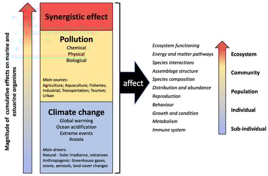For the large majority of coastal zones, human pressures occur in a cumulative way, interacting with each other and generating effects that may be additive, antagonistic or synergistic [26]. Despite the increasing volume of literature addressing cumulative impacts, there is a huge gap in the knowledge on how different pressures may interact, what are their resulting effects, and what conservation and management decisions should be made to protect and restore marine coastal ecosystems. In this review, we evaluated the synergistic effects of two of the most important pressure in coastal zones—chemical pollution and climate change. We critically review the available literature and discuss the current knowledge, the main methodological approaches that have been used to evaluate them, and also identify the main research gaps.