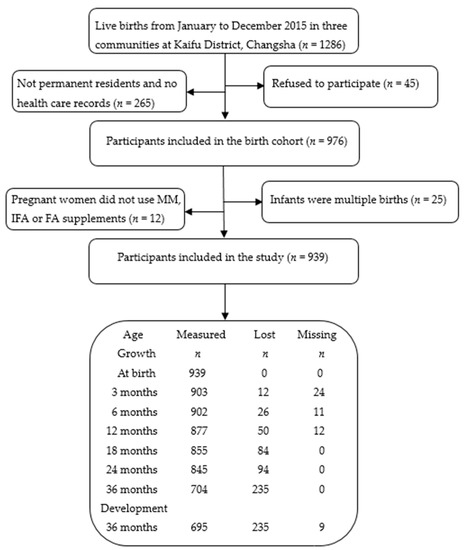 A participant flow diagram of this cohort study is shown in Figure 1. After excluding the participants who were not permanent residents and did not have health care records (n = 265), refused to participate (n = 45), did not use MM, IFA, or FA supplements (n = 12) during pregnancy, and gave birth to multiple births (n = 25), 939 mother–offspring pairs were included in our study. In addition, there were 12(1.3%), 26(2.8%), 50(5.3%), 84(8.9%), 94(10.0%), and 235(25.0%) infants who were lost to follow-up at 3 months, 6 months, 12 months, 18 months, 24 months, and 36 months, respectively.