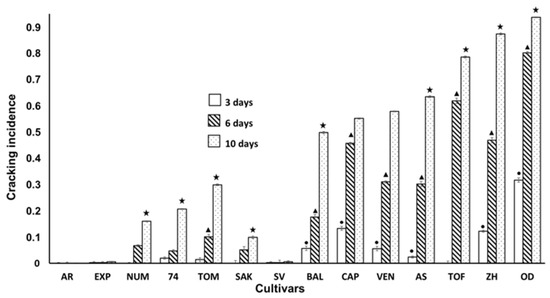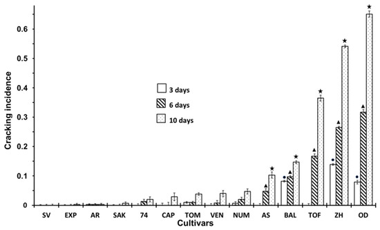 Incidence of Cracking at 3, 6 and 10 days of storage in non-inoculated fruits according to different cultivar. Statistical analysis was performed using Least Significant Difference LSD test at 95%. The star, triangle and circle (*, ●, ▲) indicate significant differences between cultivars on the same day. No symbol in the column indicates no differences.