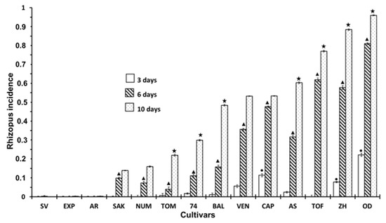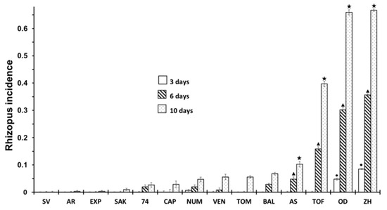 Incidence of Rhizopus at 3, 6 and 10 days of storage in non-inoculated fruits according to different cultivar. Statistical analysis was performed using Least Significant Difference LSD test at 95%. The star, triangle and circle (*, ●, ▲) indicate significant differences between cultivars on the same day. No symbol in the column indicates no differences.