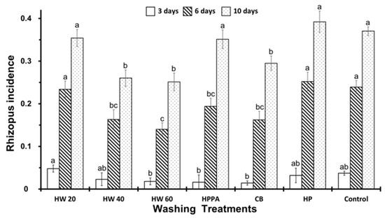 Incidence of Rhizopus at 3, 6, and 10 days of storage in inoculated fruits according to different washing treatments. Washing treatment: HW20, HW40, HW60: Hot water dip at 20, 40, and 60 °C for 20 s; HPPA: spraying 0.6% of Hydrogen Peroxide 23% + peracetic acid 15%; CB spraying Commercial Bleach at 0.5%; HP: spraying 2% of Hydrogen peroxide 50%; control: not washing. On the same day of storage, different letters (a, b, c) indicate significant differences at 5% (LSD test).