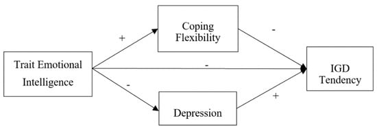The mechanisms underlying the protective influence of trait emotional intelligence against Internet-related addictions also remains understudied. Under the framework of the I-PACE model, trait emotional intelligence is conceptualized as a core personality trait, which is an antecedent to a specific Internet-use disorder, such as problematic media use [], and the effect of such a trait is presumed to be mediated by both affective and cognitive factors []. Regarding affective factors, depression is one of the most salient risk factors of Internet-related addictions in young people [,,], while coping style has been proposed to be a significant cognitive factor for Internet addiction in previous studies [,,]. Therefore, this study adopted the I-PACE model as the theoretical framework and used a longitudinal design to investigate whether trait emotional intelligence would predict IGD tendency and whether depressive symptoms and coping flexibility would mediate that relationship. In the present study, we hypothesized that there would be a negative association between trait emotional intelligence and IGD tendency.