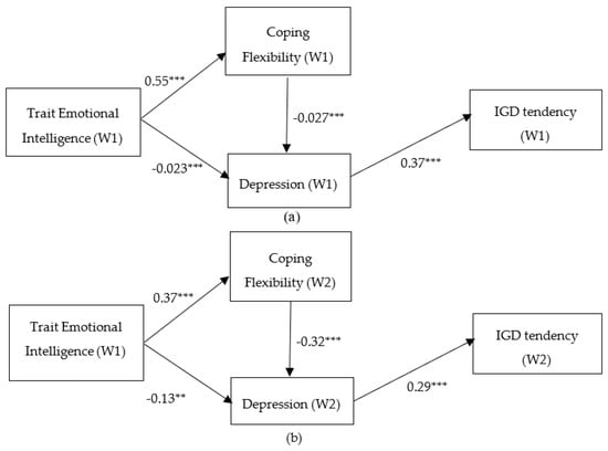 The Standardized Coefficients in the Modified Model of the Indirect Effect of Emotional Intelligence on IGD Tendency. (N = 282). Note. **: p < 0.005; ***: p <0.001. (a): The Cross-Sectional Model; (b): The Prospective Model.