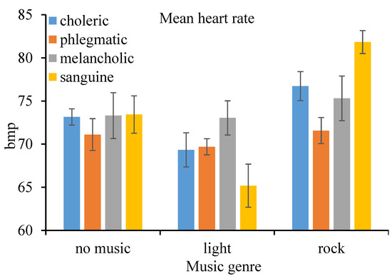 The results of M-ANOVA are summarized in Table 1. According to the results, the within-subject—music genre (F(2, 32) = 88.44, p < 0.001, = 0.847), between-subject effect—driver temperament (F(3, 16) = 7.109, p = 0.003, = 0.571), and their interaction effects (F(6, 32) = 20.08, p < 0.001, = 0.790) on the mean heart rate were all statistically significant at the 1% level. Results of pairwise comparisons indicated that the mean heart rate when driving under the influence of rock music was higher than that driving under the influence of no music. In contrast, the mean heart rate when driving under the influence of light music was lower than the control, both at the 1% level of significance. Additionally, driver temperament also moderated physiological performance. In particular, the mean heart rate of phlegmatic drivers was significantly lower than that of the counterparts, all at the 5% level (choleric: p = 0.041, melancholic: p = 0.007, sanguine: p = 0.021). Nevertheless, sanguine drivers presented lower mean heart rates (mean = 65.179, standard deviation = 2.500) under light music conditions while higher mean heart rates (mean = 81.827, standard deviation = 1.332) under rock music conditions, compared to the drivers of other groups, as shown in Figure 2.