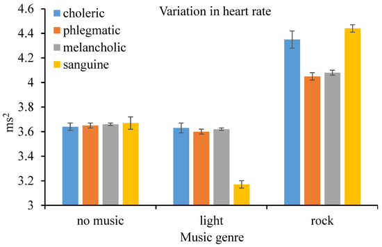 According to the results of M-ANOVA, the within-subject effect–music genre (F(2, 32) = 3108, p < 0.001, = 0.995), between-subject effect–driver temperament (F(3, 16) = 14.25, p < 0.001, = 0.728), and their interaction (F(6, 32) = 170.2, p < 0.001, = 0.970) on the variability of heart rate were all found to be significant at the 1% level. Results of pairwise comparison indicated that variability of the heart rate when driving under the influence of rock music was higher than that without music; again, variability of the heart rate when driving under the influence of light music was lower than that without music, both at the 1% level of significance. Furthermore, variability of the heart rate of choleric drivers was again higher than that of the counterparts. Nevertheless, variability of the heart rate of sanguine drivers was sensitive to the music genre. For instance, the variability was particularly high when driving under the influence of rock music but very low when driving under the influence of light music (as shown in Figure 3).
