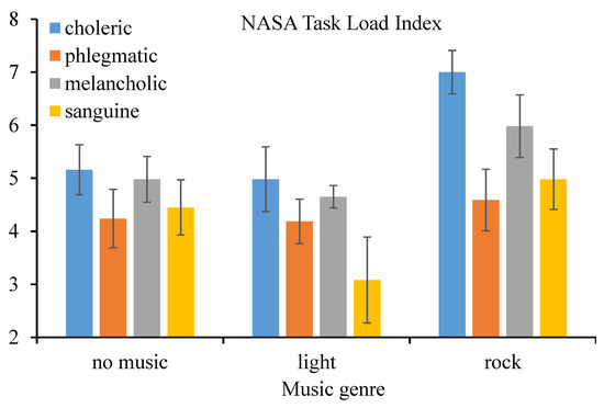 For the perceived mental workload, in accordance to the results of M-ANOVA, the within-subject effect–music genre (F(2, 32) = 211.7, p < 0.001, = 0.930) on the NASA-TLX score was statistically significant at the 1% level. In particular, the perceived mental workload when driving under the influence of rock music was higher, and that when driving under the influence of light music was lower, compared to that without music listening. Additionally, the between-subject effect–driver temperament (F(3, 16) = 10.0, p = 0.001, = 0.652) and interaction effect (F(6, 32) = 29.33, p < 0.001, = 0.846) on perceived mental workload were both significant at the 1% level. Consistently, the perceived mental workload of choleric drivers was higher than that of the counterparts (as shown in Figure 4).