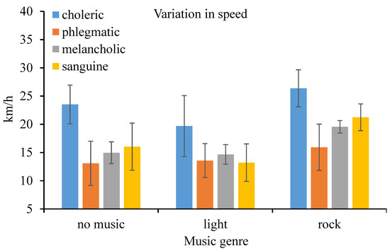With respect to the perceived mental workload (NATA-TLX score) and revealed physiological performance (heart rate), driving impairment of choleric drivers was more remarkable (both higher variability of heart rate and NASA-TLX score) than the counterparts, regardless of the presence of music and music genre. Such findings are not surprising since choleric persons are usually enthusiastic. They rapidly respond to any external stimulus and challenging tasks [21]. Indeed, external stimulus and challenging tasks induce a higher demand for cognition and information processing, and the mental workload is therefore increased. For the revealed driving performance, the standard deviation of speed of choleric drivers was also higher than that of the counterparts. This was consistent with the findings of previous studies indicating that choleric drivers tend to drive more aggressively [22].