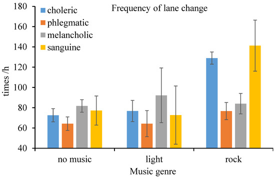 According to the results of M-ANOVA, the within-subject effect–music genre (F(2, 32) = 47.88, p < 0.001, = 0.750), between-subject effect–driver temperament (F(3, 16) = 8.021, p = 0.002, = 0.601), and their interaction effect (F(6, 32) = 11.97, p < 0.001, = 0.692) on the frequency of lane crossing were statistically significant, all at the 1% level. Again, frequency of lane crossing when driving under the influence of rock music was higher than that under the influence of light music and absence of music. Furthermore, the lane crossing frequency of phlegmatic drivers was less than that of choleric and sanguine drivers (as shown in Figure 6).