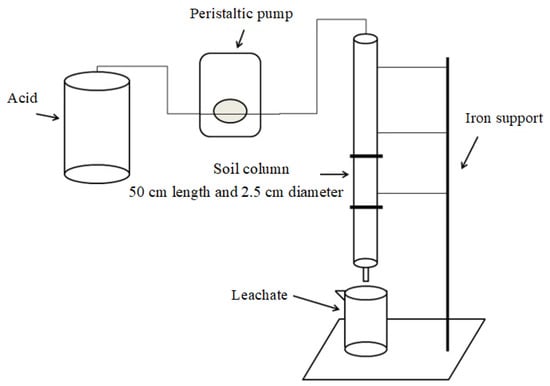 The diagram of the leaching device is shown in Figure 1. The tube body of the soil column was made by plexiglass column with 50 cm length and an inner diameter of 2.5 cm. Each column was filled with 200 g Cr-contaminated soil, with a depth of about 30 cm. The bottom of the soil column was immersed in distilled water until the saturation equilibrium, based on the pre-determined saturated moisture content (40% wt. percentage). A 100 μm-aperture sand core was placed at the bottom of the column, and a 1–2 cm thick quartz layer was placed above the sand core and then loaded the soil into the column. Columns were leached continuously with 800 mL HCl, CA, or OX, respectively. Based on our pre-experiments, the concentrations of the acids were set as 0.5 mol/L. The eluents depend on the pressure of the peristaltic pump to enter the soil column uniformly, and the flow rate was 0.75–1.00 mL/min, which was based on our pre-experiments. A volume of 40 mL acid was added at each time. The next 40 mL acid was added after 40 mL leachate of the former 40 mL acid was collected (about 12 h) using a 50 mL beaker. The leachate was filtered into a 50 mL PE plastic bottle, and then pH value was determined immediately. The concentrations of Ca, Mg, Fe, Mn, and Cr in the leachate were determined using flame atomic absorption spectrometry (FAAS) (AA-7000, Shimadzu, Tokyo, Japan). After the leaching procedure, the soil in the column was air-dried and mixed thoroughly, and then sampled for further analysis.
