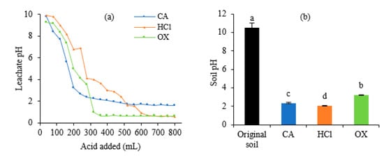 The dynamic changes of the leachate pH were shown in Figure 2a. At the beginning of the leaching (120 mL), leachate was alkaline (>7.7). With the increase of the eluents volume, pH value showed a rapid decline. When the soil received 240 mL CA, 320 mL OX, and 640 mL HCl, leachate pH decreased to 2.64, 0.94, and 0.68, respectively, and then decreased slowly and stabilized at 1.6, 0.6, and 0.5 thereafter. After the leaching procedure, pH values of soil treated with HCl, CA, and OX decreased significantly (p < 0.05) to 2.07, 2.35, and 3.20, respectively (Figure 2b).