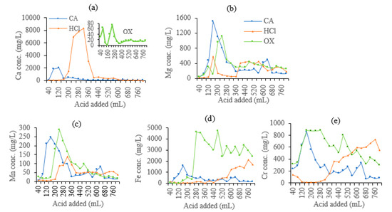 The dynamic leaching of Fe and Cr was shown in Figure 3d,e. OX had the most cumulative leaching amounts of Fe (9648 mg/kg) and Cr (2304 mg/kg) (Figure 4d,e). Cr concentration first peaked at 160 mL leachate, with 838 mg/L, while Fe concentration reached the first peak at 400 mL leachate, with 3448 mg/L. Then, Cr and Fe reached the second peak concentrations at 480 mL leachate, with 801 mg/L and 4697 mg/L, respectively. Fe and Cr dynamic concentrations reached peak values fastest in CA leachates, but CA showed the least cumulative leaching amounts (1667 mg/kg Fe and 1102 mg/kg Cr, respectively). Fe concentration in the leachate reached a peak and then decreased gradually. HCl also showed a poor ability to leach Fe (2345 mg/kg) and Cr (1282 mg/kg), with most of Fe and Cr being leached during the middle and late stages.