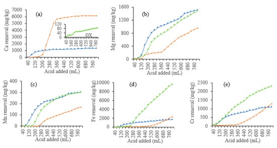 Cumulative removal of metals from the soils leached by different acids. (a) Ca, (b) Mg, (c) Mn, (d) Fe, (e) Cr.