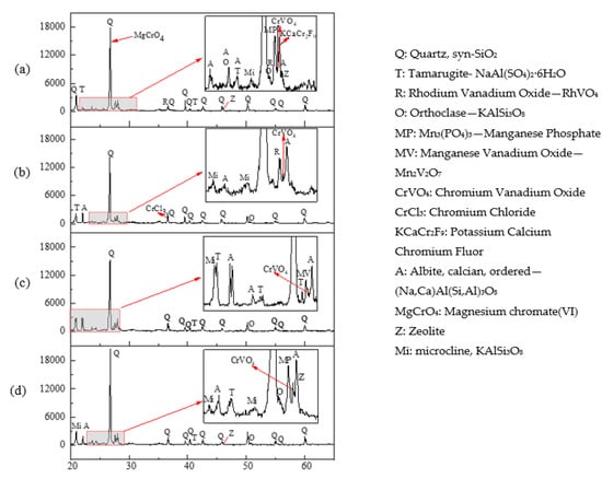 The XRD data were analyzed using Jade 7.1.2 software (Jade Software Corp., Christchurch, New Zealand). The data were analyzed using SPSS 21.0 statistical software and Microsoft Office Excel 2010. One-way analysis of variance (p < 0.05), followed by the Tukey test, was performed to determine statistical significance between the different treatments. The Pearson correlation test was performed to determine the correlation between Cr concentrations and other metal concentrations in leachates.