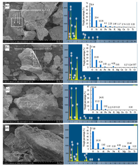 The morphology of the test soils was determined using SEM-EDS (Figure 6). The original soil and HCl-treated soil had smooth surfaces with fine grains on them (Figure 6a,b). Cerqueira et al. [37] observed Cu and Cd spotted on the surface of soil particles, and the coexistence of amorphous iron oxides, vermiculite, gibbsite, and organic matter aggregates containing Cu, and vermiculite and gibbsite aggregates containing Cd. Using field emission scanning electron microscopy (FE-SEM) with energy-dispersive X-ray spectroscopy (EDS) techniques, Cu was found on the surface of amorphous iron oxides and associated with schwertmannite [38]. Fe-rich spherules and irregular particles were commonly observed particles in technogenic magnetic particles in industrially contaminated soils, revealing various Fe contents often associated with elevated heavy metal contents [15]. After leaching by organic acids, soils showed significant morphological changes: the surfaces of soil particles became rougher and no fine-grained structures were observed (Figure 6c,d). Considering the chelation of metals by organic acids, it could be inferred that the leaching of Cr and other metal elements in the soil was related to the disappearance of these fine grains. Smaller grains have a higher specific surface area and more reaction sites, so they could be dissolved faster by acids. These results are in accordance with previous findings that heavy metals in soils were combined with certain components and showed a punctate distribution in soil particles [39,40].