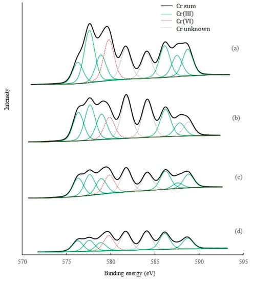 XPS analysis of Cr species in the soils before and after leaching by different acids. (a) Original soil, (b) soil leached by HCl, (c) soil leached by CA, (d) soil leached by OX.