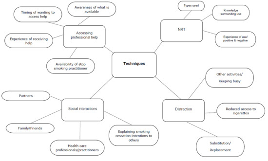 This section gives a full overview of the findings from the analysis on the data from suggestions for techniques the woman thought were or could be useful in overcoming barriers and enhancing facilitators towards quitting. Four themes were identified: accessing professional help, nicotine replacement therapy (NRT), distraction from smoking and social interactions in relation to cessation. A diagrammatic representation of the themes and sub-themes from the OSOP is displayed in Figure 1.