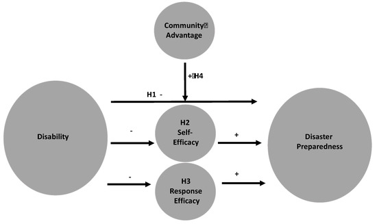 H4. Community advantage moderates the association between disability status and disaster preparedness such that when advantage is high, the negative relationship between disabilities and preparedness is weaker; conversely, when advantage is low, the negative relationship between disabilities and preparedness is stronger.