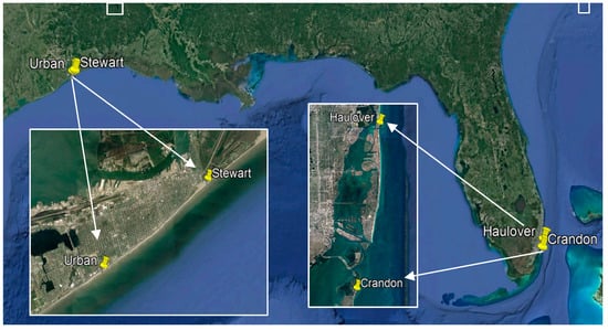 Over the summer months of 2018, researchers walked along the target beaches in Miami, Florida (Crandon (5°42′10″ N, 80°09′14″ W) and Haulover (25°54′03″ N, 80 07′19″ W)) and Galveston, Texas (Stewart (29°18′24″ N, 94°45′56″ W) and Seawall/Urban (29°16′12.4″ N, 94°49′7.4″ W)) (Figure 1). All beaches are public but have varying fees for parking. At the beaches families were approached to encourage them to participate in the survey of children’s beach behaviors. Some surveys were collected at the same time as videotaping during the summer of 2018 and other surveys were collected in the early fall of 2018. Surveys were available in English and Spanish for the family’s convenience. Researchers read a script to potential participants that explained the purpose of the survey, how it would be used, and how their personal information would be protected. Parents and guardians completed consent forms before proceeding with surveys. Although researchers typically approached families on the beach to compete the survey, the first part of the survey verified that the person completing the survey was at least 18 years old and had taken a child to the beach in the last year. If these criteria were satisfied, they were then asked to complete the remainder of survey. Some parents requested help completing surveys (i.e., comprehending the intention of certain sections). Participants were not forced to complete all sections; however, the completed surveys were checked in case participants accidently forgot to answer pages.