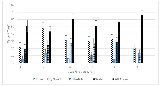 Researchers were interested in where children like to spend time while at the beach, where the survey choices were ‘dry sand’, ‘water’, ‘intertidal’, and ‘all areas’. The ‘intertidal’ region of the beach is described as the area where the tides routinely wets the sand, in high or low tide [26]. For the children under the age of six, all age groups preferred to play in the ‘all areas’, followed by ‘dry sand’, ‘water’, and then ‘intertidal’ (Figure 2). In general, 2-year-olds choose the ‘all areas of play’ less than other ages groups, but seemed to prefer ‘dry sand play’, more than other groups.