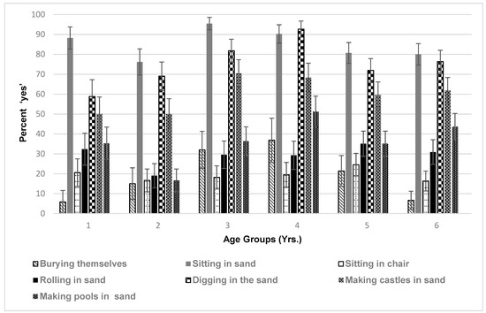 Figure 3. Percent ‘Yes’ for Being Engaged in Certain Activities. For ‘burying themselves’: significant difference between age groups 1 years and 3 years (p = 0.018), 1 years and 4 years (p = 0.014), and between 6 years and 3 years (p = 0.015), and 6 years and 4 years (p = 0.012). For ‘sitting in the sand’: significant difference between 2 and 3 year-olds (p = 0.008), a moderately significant difference between 2- and 4-year-olds (p = 0.081), a significant difference between 3- and 5-year-olds (p = 0.016) and 3- and 6-year-olds (p = 0.014). For ‘rolling in sand’: moderately significant difference between age group 2 years, and 5 years (p = 0.067). For ‘digging in the sand’: significant difference between age group 1 year and 3 years (p = 0.025), 1-year-olds and 4-year-olds (p < 0.001) and a moderately significant difference between 1-year-olds and 6-year-olds (p = 0.086). There was also a significant difference between 2-year-olds and 4-year-olds (p = 0.004), 4-year-olds and 5-year-olds (p = 0.004), and 4-year-olds and 6-year-olds (p = 0.021). For ‘making castles’: moderately significant difference between children aged 1 year and 3 years (p = 0.63), a significant difference between children aged 2 years and 3 years (p = 0.048) and moderately significant difference between 2- and 4-year-olds (p = 0.085). For ‘making pools’ in sand, there was a moderately significant difference between 1- and 2-year-olds (p = 0.063). There was also a significant difference between children aged 2 years and 3 years (p = 0.034), children aged 2 years and 4 years (p = 0.0001), children aged 2 years and 5 years (p = 0.031), and children aged 2 years and 6 years (p = 0.002).