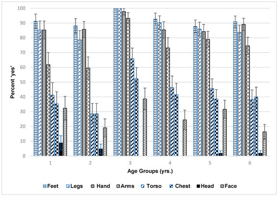 Figure 4. Child body part in contact with sand by age group. Feet: moderately significant difference between age group 1 year and 3 years (p = 0.070), significant difference between age group 2 years and 3 years (p = 0.017), moderately significant difference between 3- and 4-year-olds (p = 0.072), significant difference between 3- and 5-year-olds, and 3- and 6-year-olds. Legs: significant difference between age group 1 year and 3 years (p = 0.016), and between age groups 2 years and 3 years (p = 0.001), 3 years and 4 years (p = 0.036), 3 years and 5 years (p = 0.002), and 3 years and 6 years (p = 0.001). For hands: moderately significant difference between 1- and 3-year-olds (p = 0.055), a significant difference between 2- and 3-year-olds (p = 0.040), 3- and 4-year-olds (p = 0.038), 3- and 5-year-olds (p = 0.011), and a moderately significant difference between 3- and 6-year-olds (p = 0.070). For arms: significant difference between age group 1 year and 3 years (p = 0.001), a moderately significant difference between 1 year and 5 years (p = 0.084), a significant difference between age group 2 years and 3 years (p < 0.001), 2- and 5-year-olds (p = 0.037), 3- and 4-year-olds (p = 0.011), -, and 5-year-olds (p = 0.031), and 3- and 6-year-olds (p = 0.008). For torso: significant difference between age groups 1 year and 3 years (p = 0.026), a significant difference between age group 2 years and 3 years (p = 0.0001), a moderately significant difference between 2- and 4-year-olds (p = 0.090), a moderately significant difference between age groups 2- and 5-year-olds (p = 0.076), a moderately significant difference between 3- and 4 year-olds (p = 0.065), a significant difference between 3- and 5-year-olds (p = 0.037), and between 3- and 6 year-olds (p = 0.004). For chest: a significant difference between age groups 2- and 3-year-olds (p = 0.021). For head: a moderately significant difference between 1- and 3-year-olds and 1- and 4-year-olds only (p = 0.070). For face: a moderately significant difference between age groups 1- and 6-year-olds (p = 0.091), a significant difference between 2- and 3-year-olds (p = 0.040), and 3- and 6-year-olds (p = 0.012), and a moderately significant difference between age groups 5 years and 6 years (p = 0.055) for face in contact with sand.