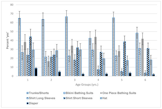 Figure 5. Child clothing preferences by age group. For trunks: a significant difference between 1- and 4-year-olds (p = 0.037), 2- and 4-year-olds (p = 0.040) and 3- and 4-year-olds (p = 0.015), a moderately significant difference between 3- and 6-year-olds (p = 0.052), a significant difference between 4- and 5-year-olds (p = 0.018) and a moderately significant difference between 5- and 6-year-olds (p = 0.061). For one piece bathing suits: significant difference between age groups 1 year and 2 years (p = 0.034), a moderately significant difference between 2- and 3-year-olds (p = 0.058), 2- and 4 year-olds (p = 0.005), and 2- and 6-year-olds (p = 0.004). For long sleeved shirts: a significant difference between 1 year and 5 years (p = 0.020), 1- and 6-year-olds (p = 0.010), 2- and 5-year-olds (p = 0.021), and 2- and 6-year-olds (p = 0.009). In addition, there was a significant difference between 3- and 5-year-olds (p = 0.048) and 3- and 6-year-olds (p = 0.022) and a moderately significant difference between children aged 1 year and 4 years (p = 0.052), and 2- and 4-year-olds (p =0.061). For short sleeved shirts: a moderately significant difference between children aged 1 year and 2 years (p = 0.059).
