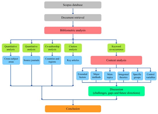 Based on the aforementioned information, the bibliometric analysis method and content analysis method were the primary methods used to achieve the goals of this study. Previous bibliometric studies have generally followed a specific analytical framework [19,29,30,31]. Specifically, this study was carried out according to the following steps: (1) quantitative analysis was conducted to present the cross-subject areas and source journals of 531 articles; (2) co-authorship analysis was conducted to identify the most productive countries and regions; (3) citation analysis was performed to identify the key articles; and (4) keyword co-occurrence and further content analysis were performed to uncover the main topic, major methods, extended factors, integrated theories, specific groups, and control variables. Based on the above analysis, a comprehensive discussion will be presented. The detailed research framework is shown in Figure 2.