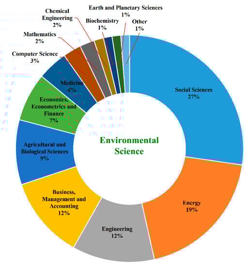 According to Scopus’s classification system for subjects, a document may belong to more than one subject area. Indeed, 531 articles in the field of environmental science belonged to 16 other subjects, including social sciences; energy; engineering; business; management and accounting; agricultural and biological sciences; economics, econometrics and finance; medicine; computer science; and other subjects. The detailed distribution is shown in Figure 4.